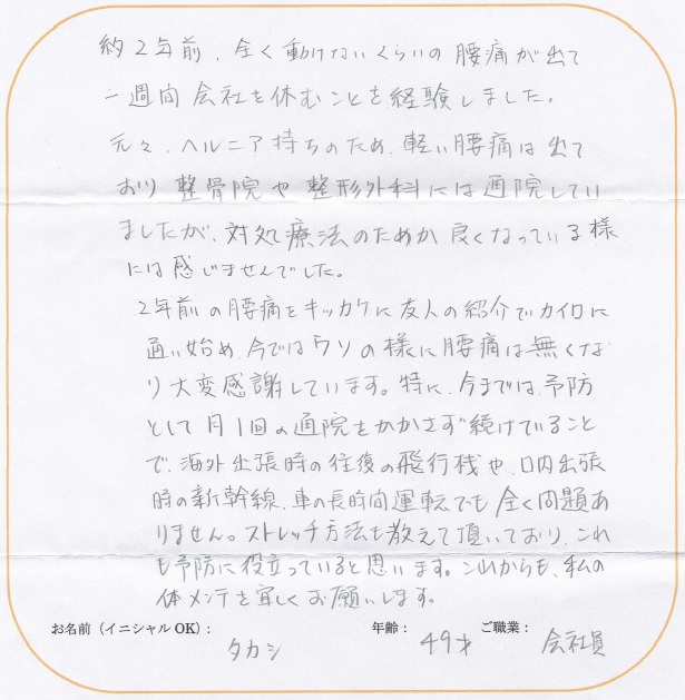 2年前の腰痛をキッカケに友人の紹介でカイロに通い始め今ではウソの様に腰痛は無くなり大変感謝しています。
