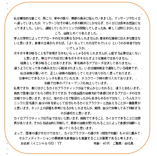 私見ですが、巷にはびこるカイロプラクティックが全て安心かといわれると、違うとおもいます。