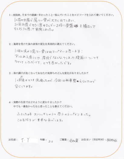 2人目出産でもう1度ゆるんでいる時に骨盤を矯正してもらおうと思って来院しました。