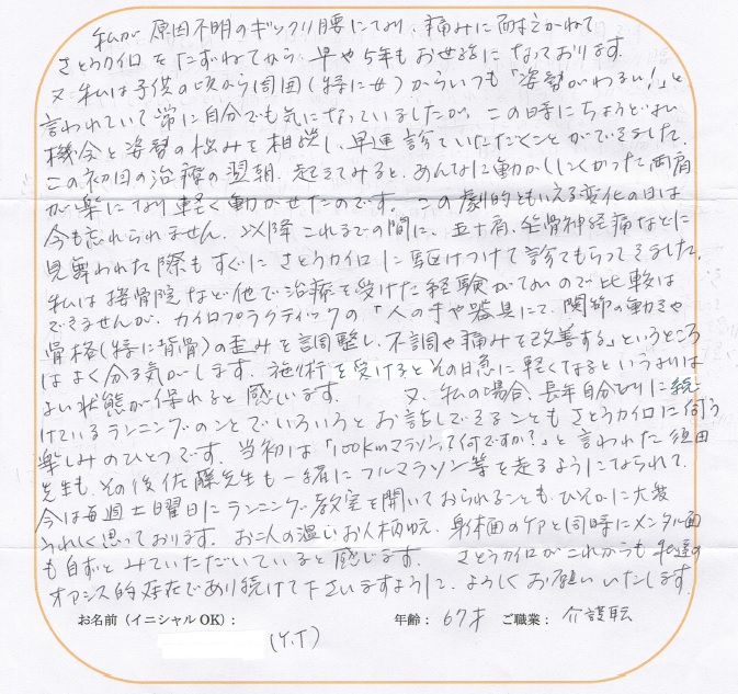 私が原因不明のぎっくり腰にて、痛みに耐えかねてさとうカイロをたずねてから早や5年もお世話になっております。又、私は子供の頃から周囲(特に母)からいつも「姿勢がわるい!」と言われていて常に自分でも気になっていましたが、この時にちょうどよい機会と姿勢の悩みを相談し、早速診ていただくことができました。この初回の治療の翌朝、起きてみるとあんなに動かしにくかった両肩が楽になり軽く動かせたのです。この劇的ともいえる変化の日は今も忘れられません。以降、これまでの間に五十肩、坐骨神経痛などに見舞われた際もすぐにさとうカイロに駆けつけて診てもらってきました。私は接骨院など他で治療を受けた経験がないので比較はできませんが、カイロプラクティックの「人の手や器具にて関節の動きや骨格(特に背骨)の歪みを調整し不調や痛みを改善する」というところはよくわかる気がします。施術を受けるとその日急に軽くなるというよりはよい状態が保たれると感じます。又、私の場合、長年自分なりに続けているランニングのことでいろいろお話できることもさとうカイロに伺う楽しみのひとつです。当初は「100kmマラソンって何ですか?」と言われた須田先生も、その後佐藤先生も一緒にフルマラソン等を走るようになられてうれしく思っております。お二人の温かいお人柄ゆえ、身体面のケアと同時にメンタル面も自ずとみていただいていると感じます。さとうカイロがこれからも私たちのオアシス的存在であり続けてくださいますように、よろしくお願いします。